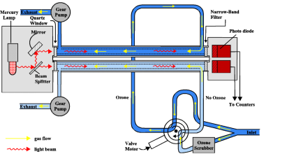 意大利ETG公司的在線式EDK7100型臭氧分析儀,基于紫外光源的朗伯比爾 Beer-Lambert定律,當254nm紫外光通過臭氧氣體樣品腔室時被臭氧吸收,吸收值與臭氧濃度遵循朗伯比爾定律,通過測量吸收前和吸收后的紫外光信號的變化值,與參考光源進行比對計算,并分析出被測臭氧的濃度值。