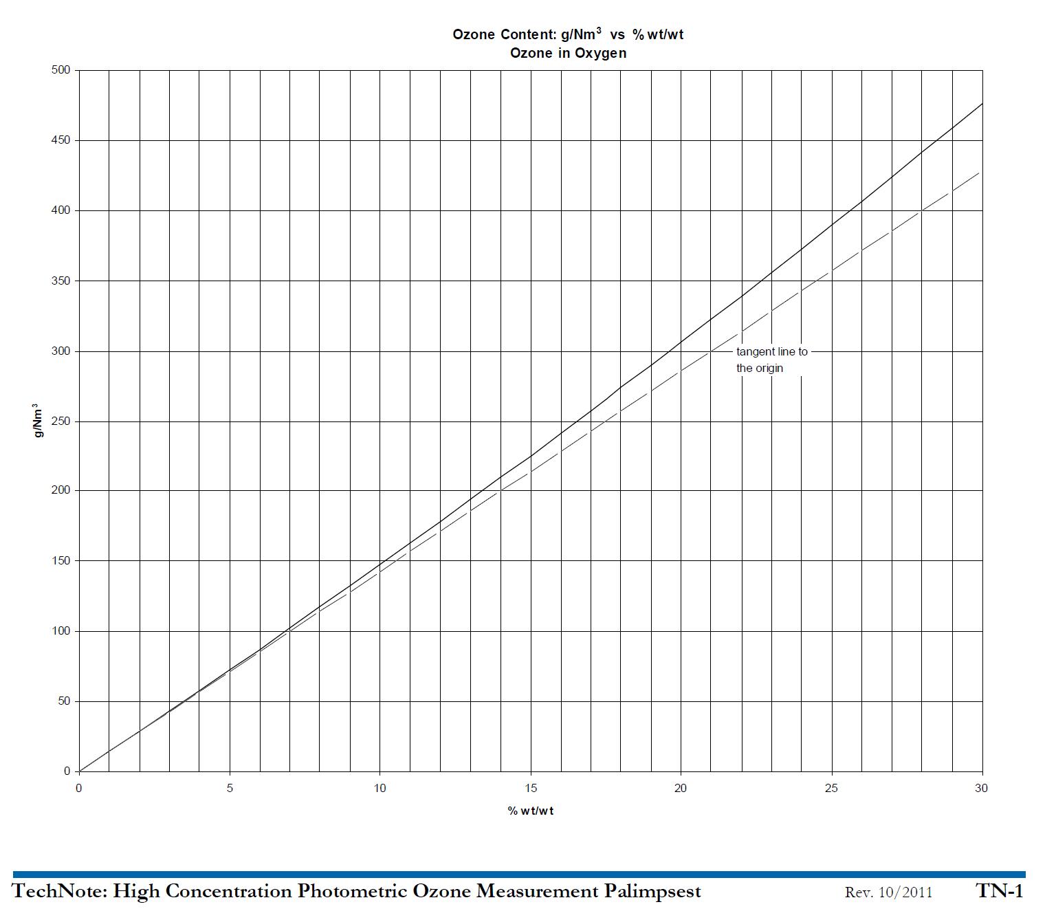 1 Nm3是在0℃和1 atm條件下每立方米所含的樣品氣體的質量。這是一個重要的事實,氣體混合物(臭氧和載氣)隨著臭氧含量的變化而改變密度,因為氧(一個氧分子有兩個原子)當它轉化成臭氧(一個臭氧分子有三個原子)時“收縮”。在商g/Nm3中,分子分母都隨著臭氧含量的變化而變化,使得g/Nm3和% wt/wt之間的關系是非線性的!